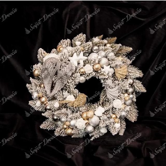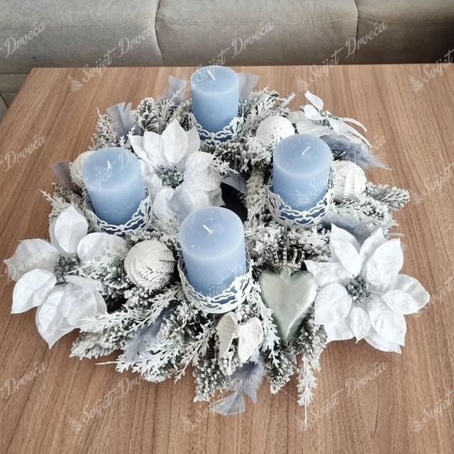 Bijela i plava boja nedvojbeno su na prvom mjestu među bojama u koje odijevamo svoje božićne vjenčiće. Ovaj božićni vijenac poseban je po tome što je ukrašen s četiri svijeće, što ga čini prekrasnim maštovitim adventskim vijencem. Kao ukras ovaj vijenac možete staviti na stol početkom došašća i svake nedjelje do Božića zapaliti po jednu svijeću. Kupac je odabrao prekrasnu bijelu dekoraciju u kojoj je kombinirano bijelo cvijeće s božićnim kuglicama i sve modernijim anđeoskim krilima. Nezaobilazni vrhunac ovog adventskog vijenca je srebrno srce s kraljevskom krunom, koje savršeno nadopunjuje blijedoplave božićne svijeće za adventski vijenac. Budući da je ovaj vijenac ukrašen nježnim bojama, možete ga koristiti bilo gdje. Možete ga staviti na stol ili komodu, a pogodan je i kao božićni vijenac na grobu. Kad god dođete nakon toga, možete zapaliti svijeću za sjećanje na svoje najmilije.