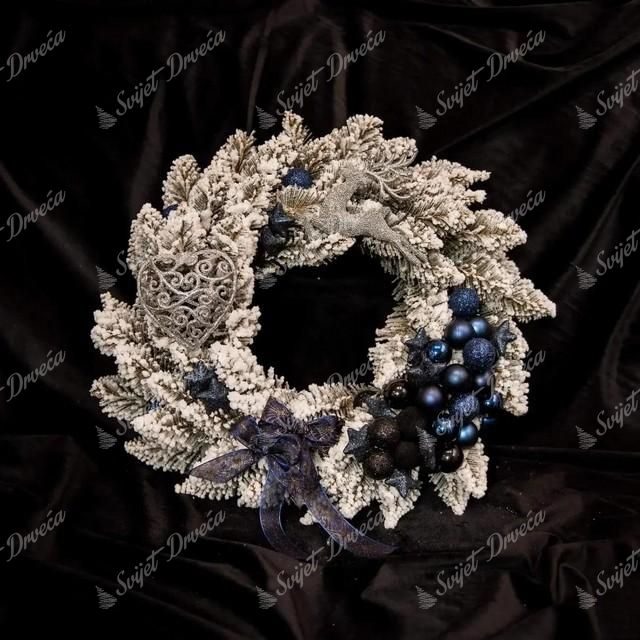 Ovaj unikat je sto posto u kategoriji “moderni božićni vijenac za vrata“. Udžbenički odabrani tamnoplavi ukrasi u kontrastu sa snježnim vijencem oku su ugodna kombinacija. Kupac je odabrao različite nijanse tamnoplave za dekoraciju, neki ukrasi postaju gotovo crni. Plave božićne kuglice i zvjezdice nadopunjuju dvije tamnoplave mašnice koje upotpunjuju prekrasan prijelaz između plavih i srebrnih svjetlucavih ukrasa. Diskretno odabrani srebrni ukrasi u obliku srca i sobova gotovo se stapaju sa snježnim tijelom božićnog vijenca. Objesite li ovako ukrašen božićni vijenac na ulazna vrata, garantiramo da će svaki prolaznik zastati.