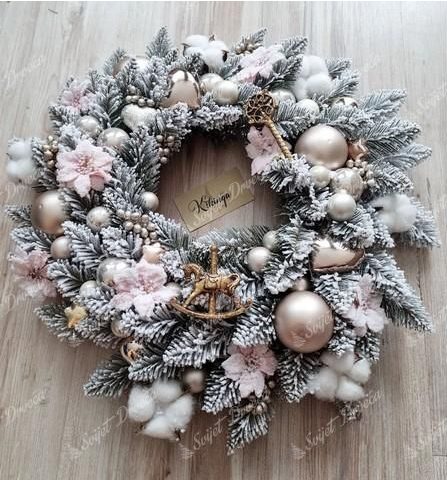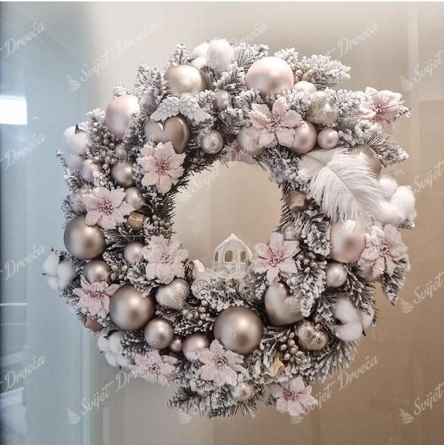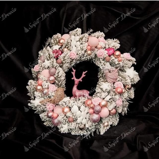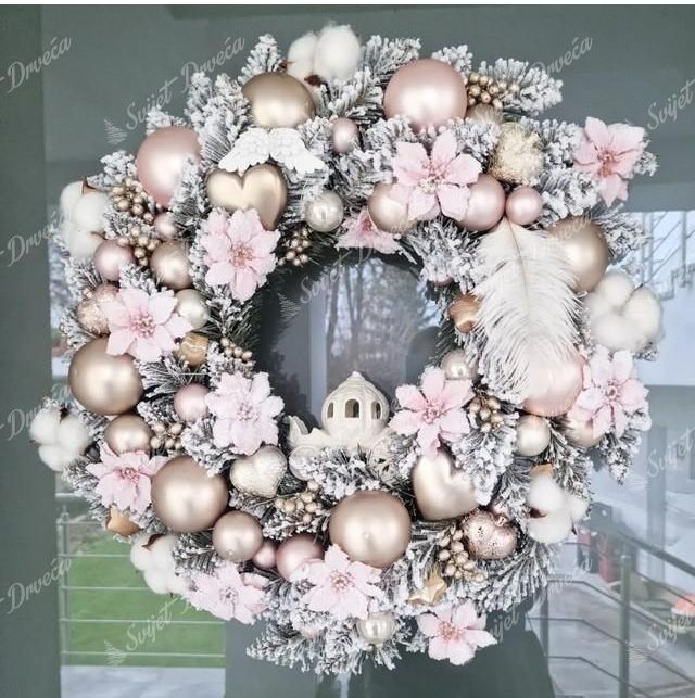 Razmišljate li koje božićne ukrase koristiti za vijenac? Kako dalje idemo, kombinacija boja bijele i ružičaste postaje modernija. Ovaj snježni božićni vijenac, gusto ukrašen nježnim bojama, svakako je dokaz da će se jarke boje lijepo vidjeti i na bijelom tijelu božićnog vijenca. Vijenac je ukrašen blijedoružičastim cvjetovima u kombinaciji s božićnim kuglicama koje se mijenjaju od srebrne do zlatne. Vijenac je detaljiziran zahvaljujući zlatnim srcima i zvijezdama poduprtim zlatnim ključem i konjićem za ljuljanje. Ovako bogato ukrašen božićni vijenac ukrasit će svaki prostor u koji ga postavite. Svejedno hoćete li od njega napraviti adventski vijenac za stol ili vrata, samo će doprinijeti blagdanskom ugođaju i razveseliti vas svaki put kad ga pogledate.