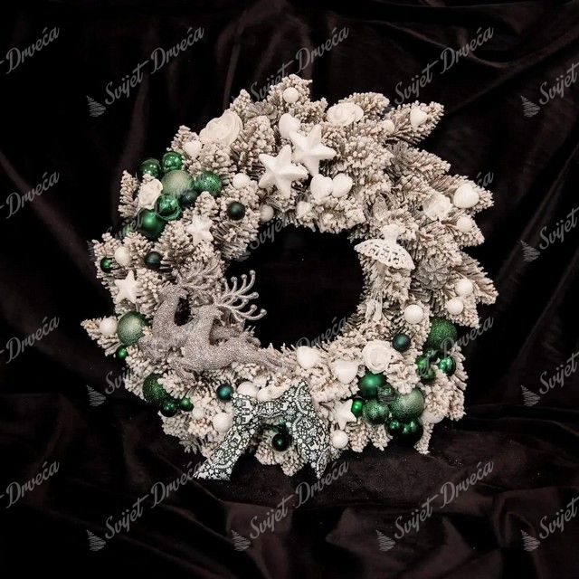 Imamo još jednu inspiraciju za vas, kako bi mogli izgledati božićni vijenci za vrata. Ovdje opet imamo snježni božićni vijenac, koji je ukrašen ukrasima u raznim nijansama zelene. Zelene božićne kuglice dolaze u različitim dezenima, od svijetlo zelenih do tamnih, od mat do svjetlucavih. Zelenoj boji društvo pravi i snježno bijela boja u koju su odjevene zvjezdice, srca i cvjetići. Neizostavan dio ovog vijenca je par srebrnih svjetlucavih sobova u neposrednoj blizini zeleno-bijele mašne. Izrada takvog božićnog vijenca ne traje nekoliko minuta, ali rezultat je sto posto vrijedan toga. Svatko tko bi vidio ovakav vijenac, reći će da mu hitno treba. Može poslužiti kao božićni vijenac za vrata, božićni vijenac za stol ili komodu, a možete njime ukrasiti i policu ili prozorsku dasku.
