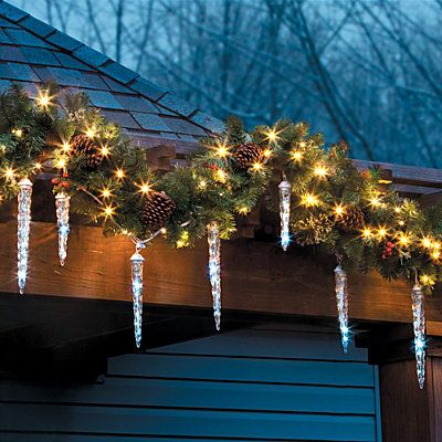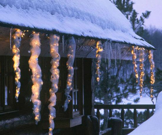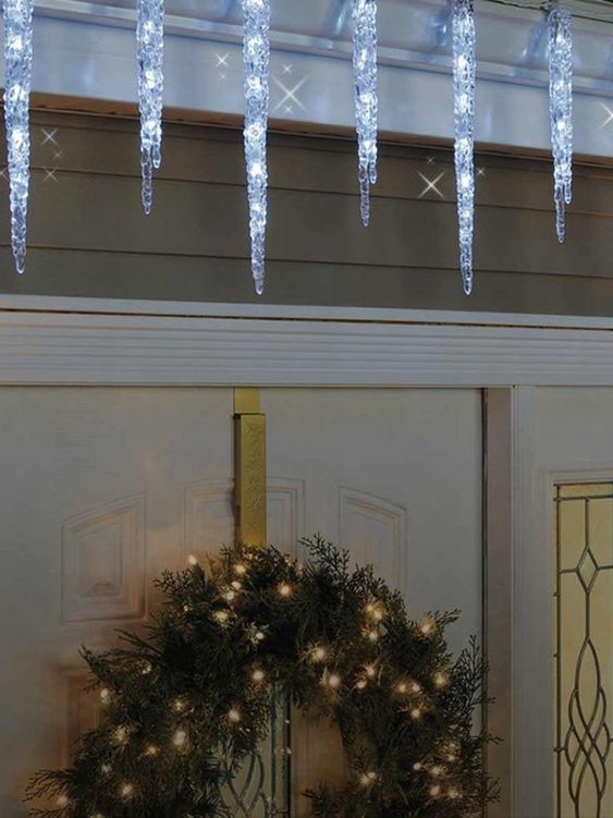 Poput kiše koja pada, svijetleće ledenice su prekrasan, elegantan dodatak božićnim ukrasima. Takve lampice najprikladnije su za izbočinu. Tamo ih možete posebno pričvrstiti, ili ih omotati na vijenac s kojeg će visjeti.