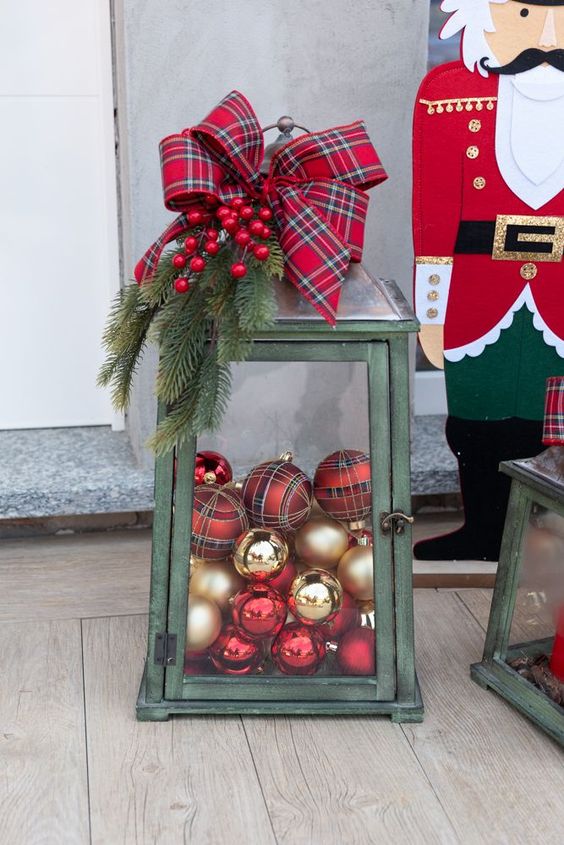 Odličan savjet za vas je napuniti stari lampion božićnim kuglicama i na vrh lampiona pričvrstiti četinar, šišarke ili mašnu. Takav će ukras lijepo stajati ispred vaših ulaznih vrata.