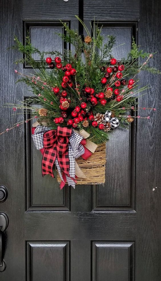 Jednako sjajan savjet za ukrašavanje vrata je i košarica od slame pričvršćena na vrata, u koju stavite šišarke, crvene bobice i cijeli ovaj ukras upotpunite vrpcama. Ali koliko je jednostavno, zar ne?