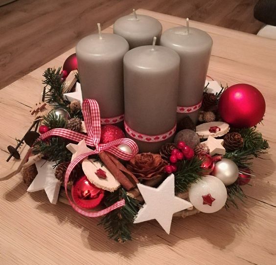 Za izradu božićnih vijenaca na stolu možete koristiti božićne kuglice, vrpce, mašne, cvijeće, razne figure ili ukrase raznih oblika. Nema granica za fantaziju. Važno je samo da boje na božićnom vijencu i stil ukrašavanja božićnog vijenca odgovaraju cjelokupnom uređenju vašeg stana.