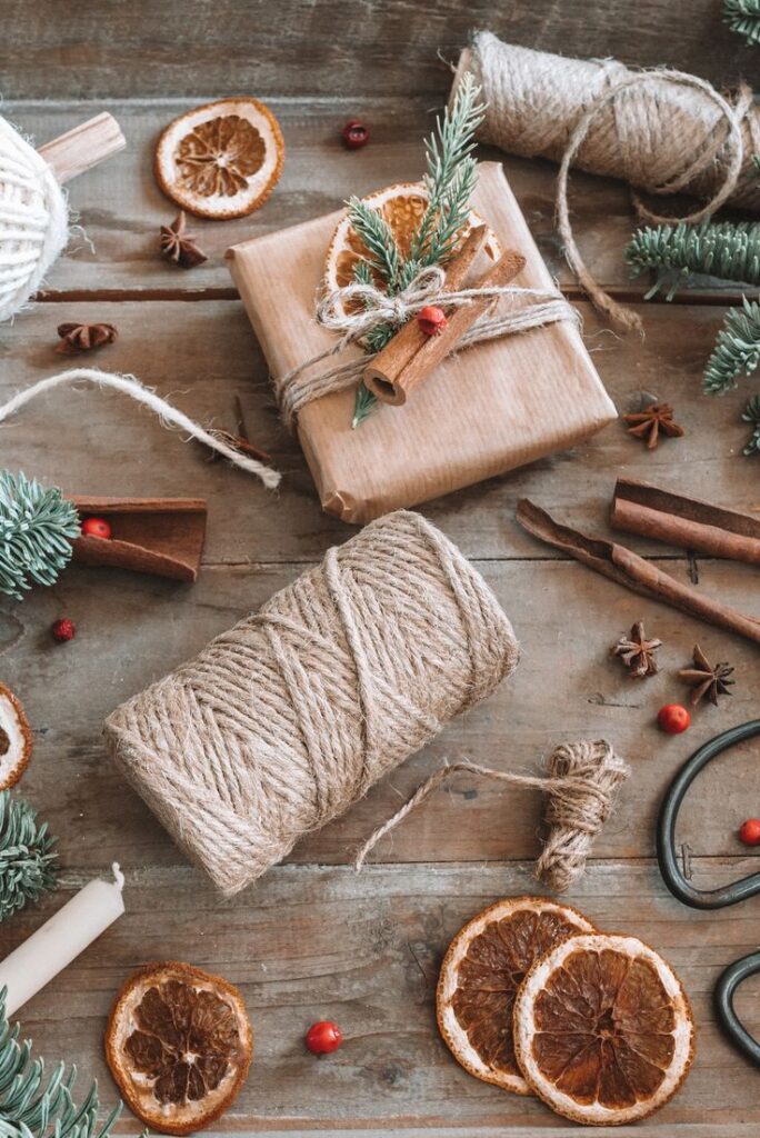 Osnovu može činiti običan smeđi papir. Možda djeluje jednostavno i dosadno, no uz male detalje poprima jedinstven izgled. Izgledat će originalno ako dodate grančicu, češere ili sušene naranče te sve povežete jutarnim konopcem.