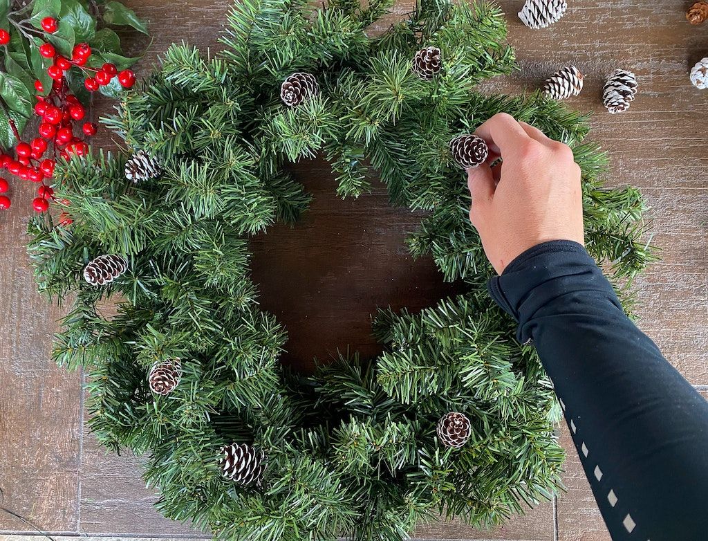 Dodajte manje ukrase poput češera, bobica i kuglica, ravnomjerno ih rasporedite. Pričvrstite ih pištolom za vruće ljepilo, florističkom žicom ili vrpcama – kako vam odgovara.