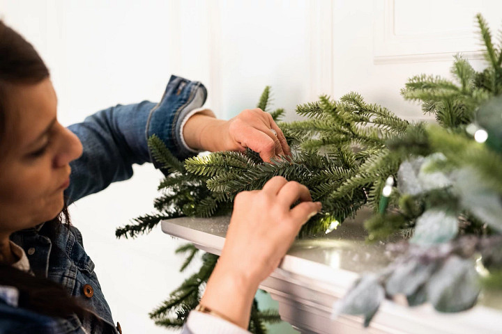 Prije ukrašavanja, položite vijenac ili girlandu na ravnu površinu. Nježno raširite i oblikujte grane.