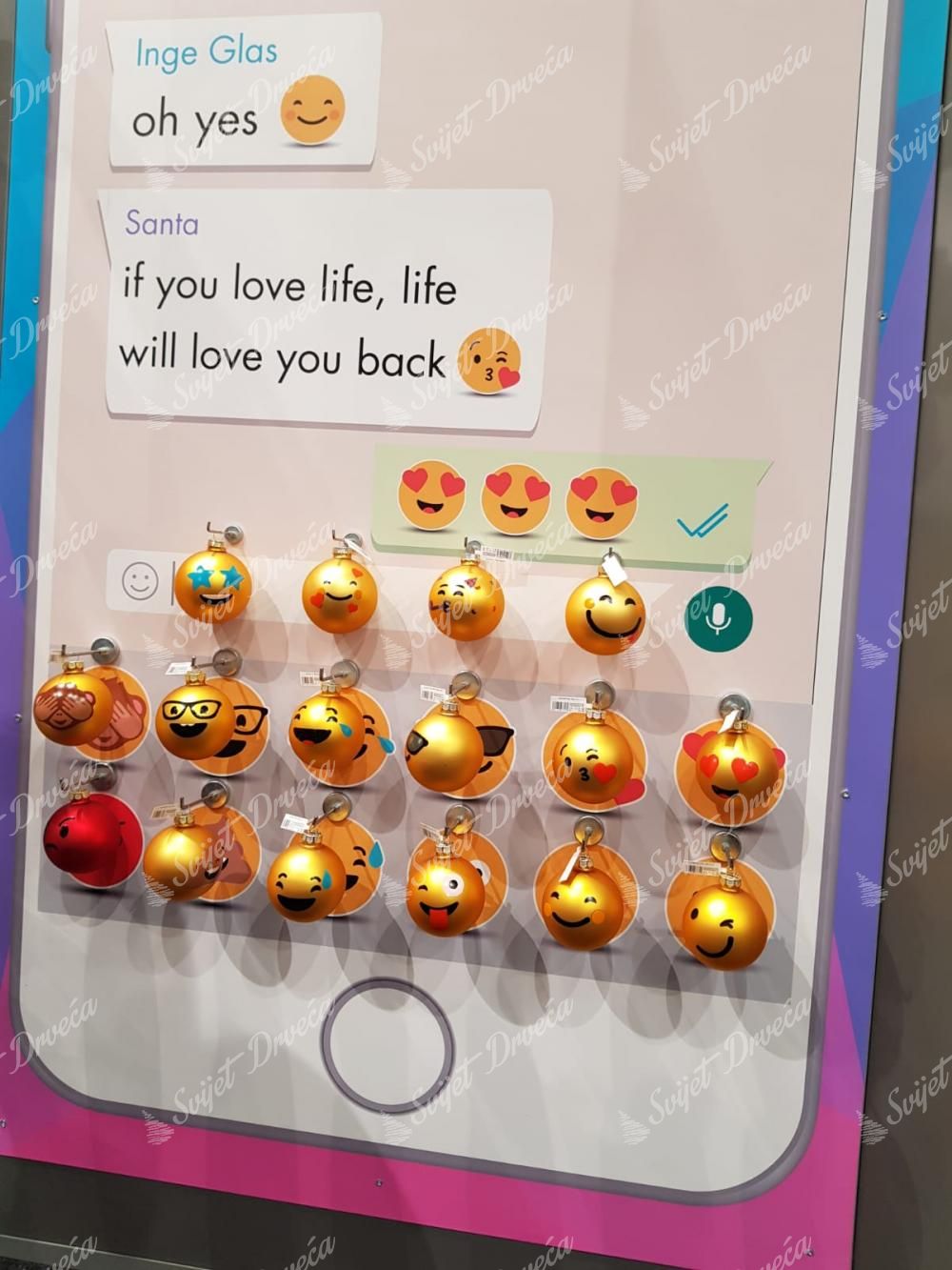 Božićne kuglice na drvcu u obliku smajlića? Zašto ne! U današnje vrijeme, kada su društvene mreže sastavni dio nas, možda je bilo samo pitanje vremena kada će netko smisliti takvu ideju za moderne božićne ukrase. Jeste li bijesni, sretni, umorni ili zaljubljeni? Ukrasima u obliku smajlića možete ukrasiti svoje drvce prema trenutnom raspoloženju. Budući da ovo u ovom slučaju nisu uobičajeni ukrasi, vjerojatno za njima posežu ljudi s velikim smislom za humor koji božićne ukrase ne shvaćaju tako ozbiljno.
