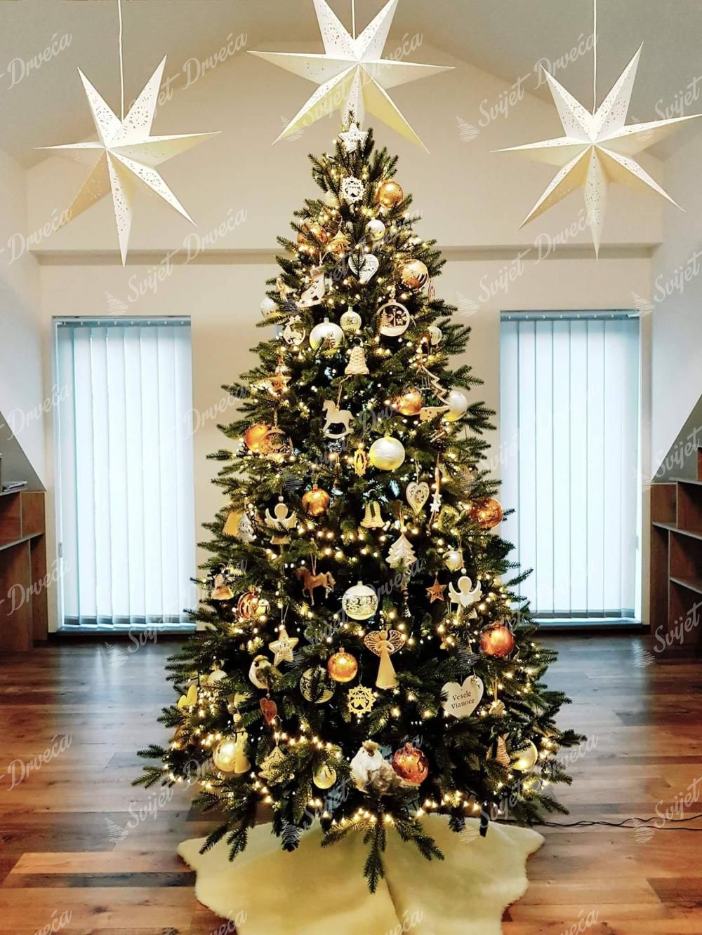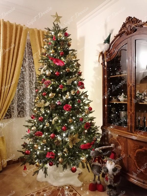 Drvo je u sredini zadebljano klasičnom PVC iglom, što mu daje bogat i gust izgled. U proizvodnji naših drvca koriste se najkvalitetniji PE i PVC materijali zahvaljujući kojima će vam trajati desetljećima. Drvo ima čvrstu željeznu konstrukciju, a paket uključuje stabilni metalni stalak.