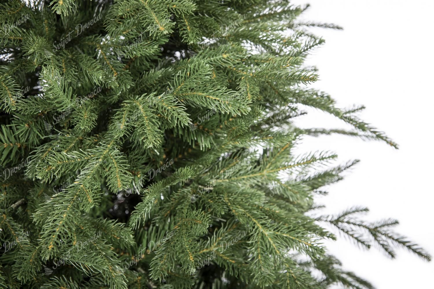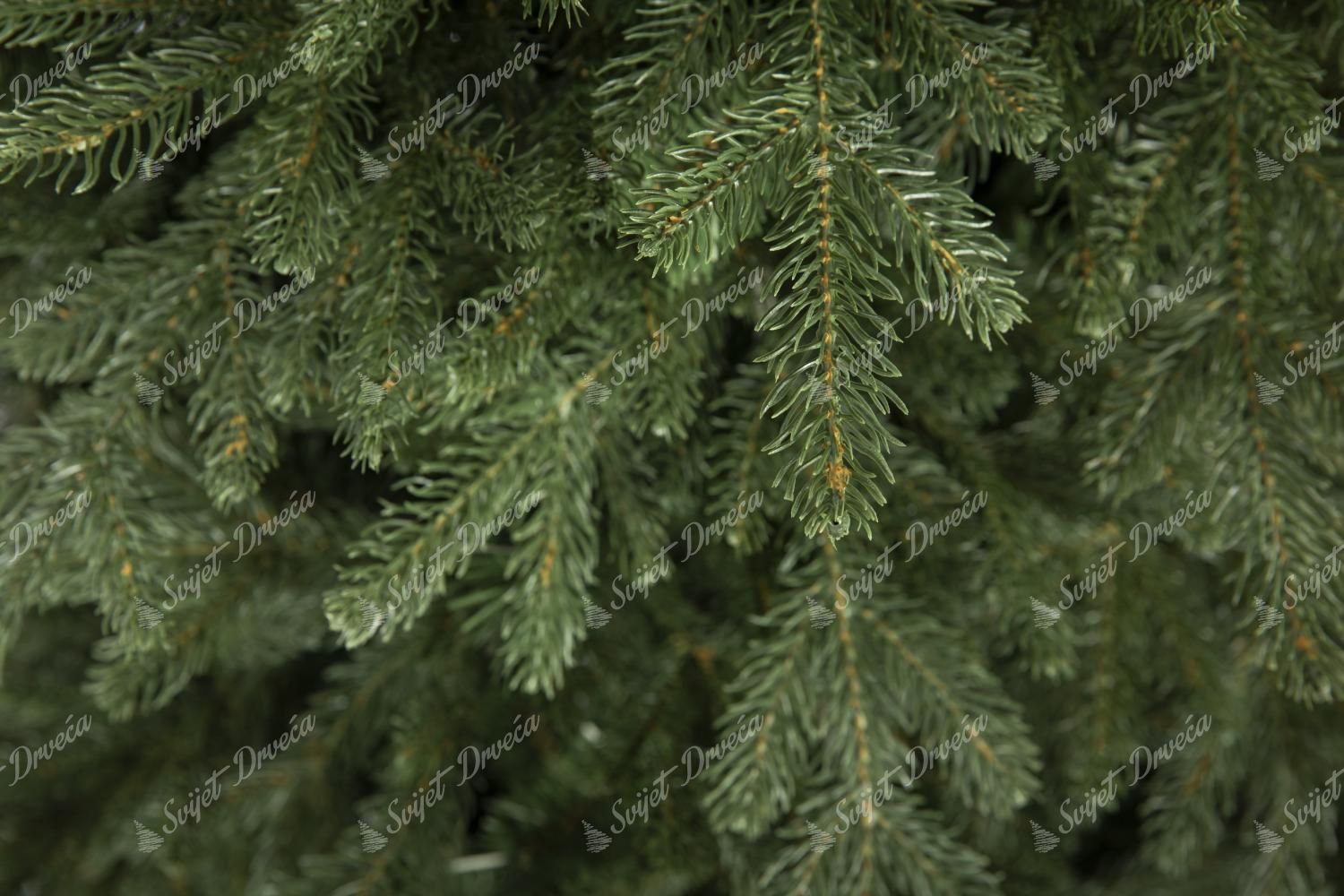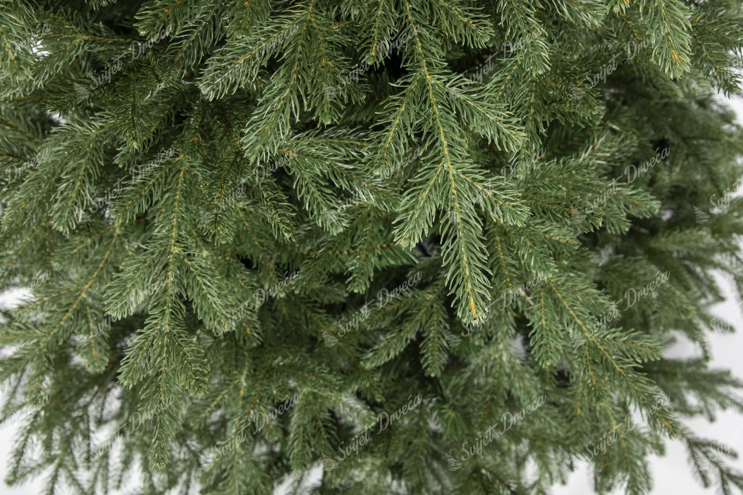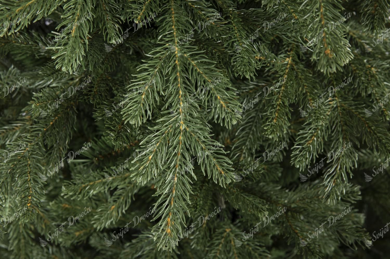 Tamnozelene grančice smreke savršeno su strukturirane po obodu drveta. 3D igla izrađena je pomoću najnovije i najnaprednije tehnologije koja savršeno nalikuje živim grančicama. U proizvodnji naših 3D grančica koriste se samo najkvalitetniji PE materijali. Središte drveta zadebljano je klasičnim PVC iglicama iste tamnozelene boje.