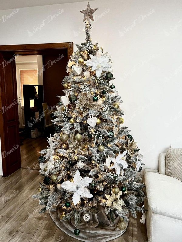 Moderno, snijegom prekriveno umjetno božićno drvce, Bijela Smreka, ovo bijelo božićno drvce karakteriziraju visokokvalitetne zelene smrekove grančice koje nose debeli sloj umjetnog snijega.