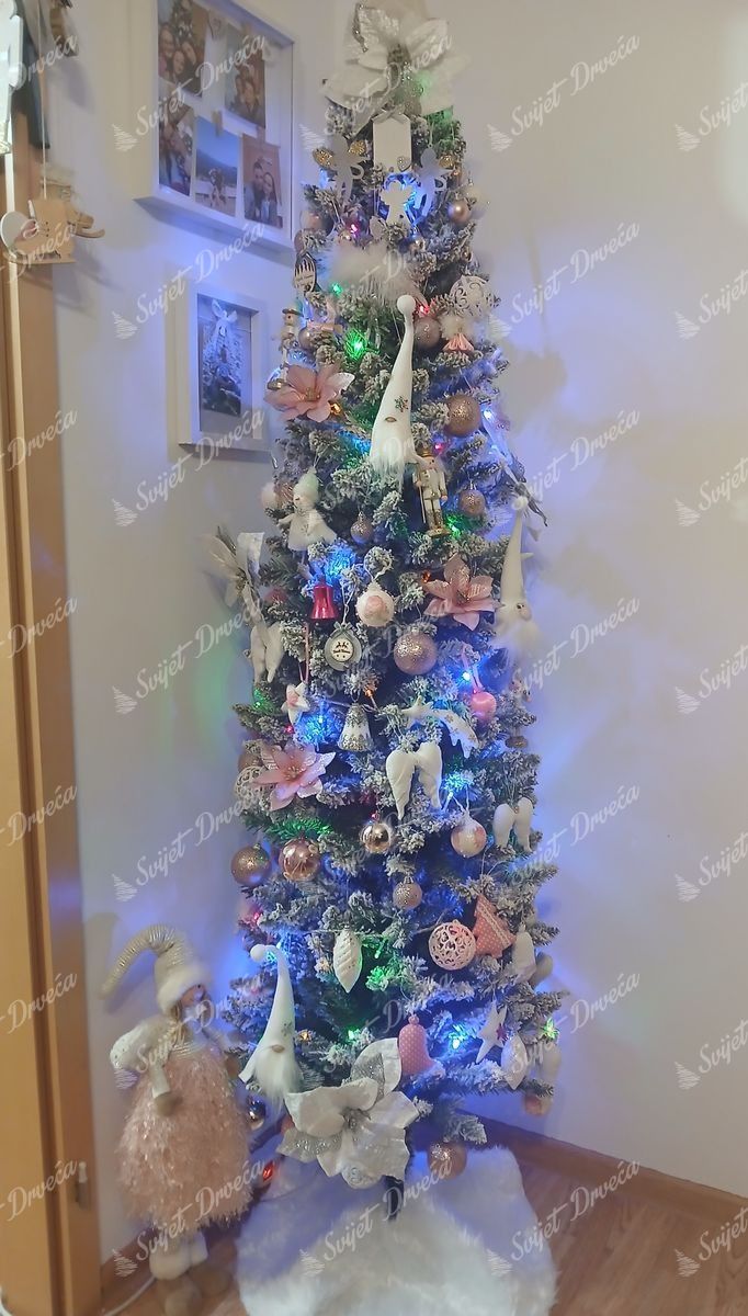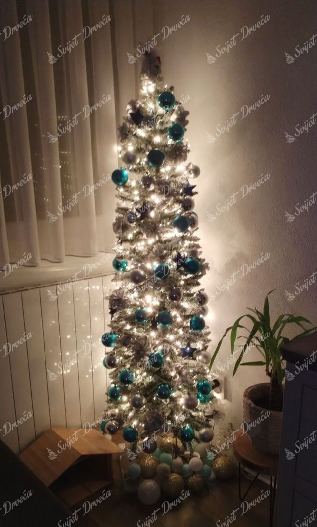 Novo za sezonu 2024 – moderno zasnježeno drvce u uskoj verziji Smreka Biely Štíhly stvara nezaboravan snježni ugođaj zahvaljujući PVC grančicama smreke koje su gusto prekrivene realističnim umjetnim snijegom. Umjetni snijeg se nanosi najsuvremenijom tehnologijom i ne opada. Tijekom početne raspodjele mogu se osloboditi neuhvaćeni dijelovi snijega.